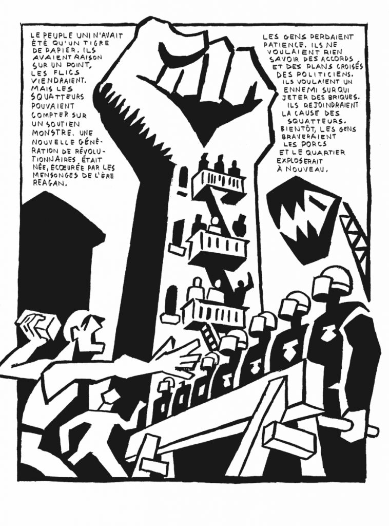 Au bout de toutes ces années, je me suis retrouvé avec une histoire à raconter. Il y avait des personnages singuliers, non pas des allégories ni des catégories sans visages, mais des individus bien réels. Cela m’a forcé à écrire des récits plus traditionnels. À ce moment-là, j’étais très marqué par le travail de David Lloyd et Alan Moore, V pour Vendetta et les Watchmen. D’un point de vue graphique, j’adorais que David Lloyd soit si ennuyeux – avec son découpage régulier de la planche souvent en neuf cases et son style de dessin sobre –, il se contentait de raconter une histoire. Je me suis dit que moi aussi, je pouvais en raconter une, celle des squats des années 1980 telle que je m’en souvenais, telle qu’elle s’était déroulée. Et c’est comme ça qu’est né Quartier en guerre, qui est à la fois un travail de journaliste – car je me fondais sur des entretiens avec des gens – et une autobiographie – car je racontais mes souvenirs.
